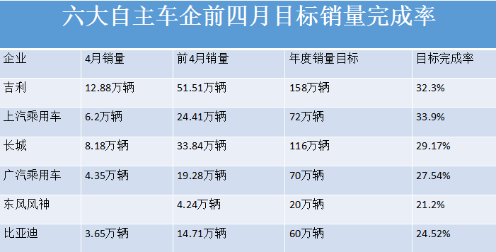 不过,广汽乘用车、东风风神和比亚迪目前的销量完成则不足30%。广汽乘用车前四月整体销售19.28万辆,完成了70万销量目标的27.54%;比亚迪前四月整体销量为14.71万辆,完成60万年度销量目标的24.52%;东风风神前四月整体销量为4.24万辆,完成了20万年度销量目标的21.2%。