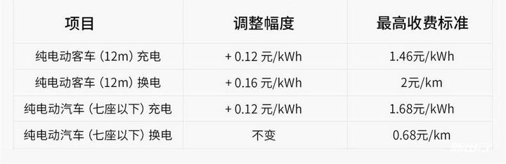 调整纯电动客车(12m)充、换电服务最高收费标准、纯电动汽车(七座以下)充电服务最高收费标准,分别上调每千瓦时 0.12 元、每公里 0.16 元、每千瓦时 0.12 元。调整后的纯电动客车(12m) 充、换电服务最高收费标准、纯电动汽车(七座以下)充电服务最高收费标准分别每千瓦时 1.46 元、每公里 2.00 元、每千瓦时 1.68 元。