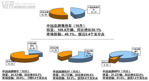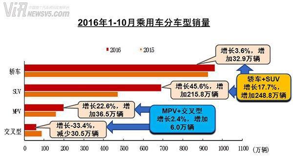 1-10月,乘用车产销分别完成1910.5万辆和1909.6万辆,比上年同期分别增长15.3%和15.4%;与1-9月相比,产销量增速分别提高0.6和0.7个百分点。乘用车四类车型产销情况看,比上年同期,轿车产销均增长3.6%;SUV产销继续保持高速增长,分别增长45.7%和45.6%;MPV产销增速分别为19.7%和22.6%;交叉型乘用车产销分别下降34.2%和33.4%。