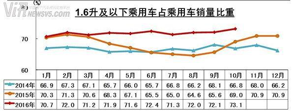 10月1.6升及以下乘用车销售171.3万辆,比同期增长28.1%,高于乘用车总体增速7.8个百分点,1.6升及以下乘用车占乘用车销量比重为73.1%。1-10月,1.6升及以下乘用车销售1374.8万辆,比同期增长22.8%,占乘用车销量比重为72%,比上年同期提高4.1个百分点。