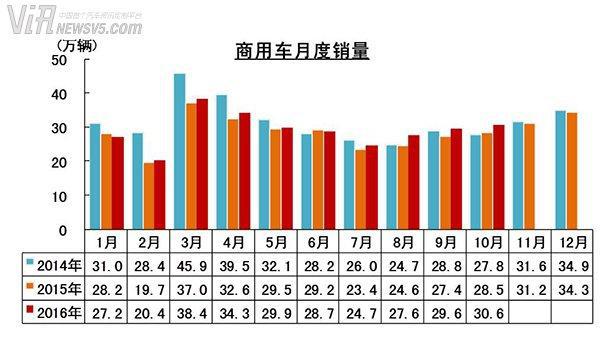 10月商用车产销分别完成29.9万辆和30.6万辆,与上月相比,产量持平,销量增长3.4%;比上年同期分别增长3.5%和7.4%,增速放缓。分车型产销情况看,客车产销量比上年同期分别下降6.9%和12.9%;货车产销量比上年同期分别增长5.6%和11.5%。