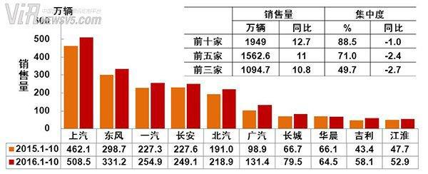 1-10月,汽车销量排名前十位的企业集团销量合计为1949万辆,同比增长12.7%,低于行业增速1.1个百分点。占汽车销售总量的 88.5%,与上年同期相比下降1.0个百分点。