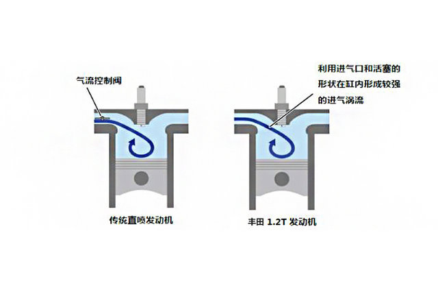 丰田1.2T发动机通过调整进气口以及活塞顶的形状,让气缸内的气流更为理想的流动,增强了滚流比。更为充分快速的燃烧过程进一步提高了热效率,减轻了氮氧化物排放。