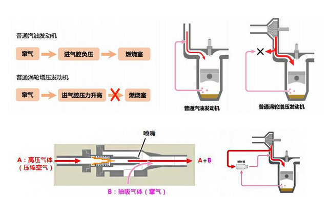 窜气是涡轮增压发动机导致机油过早劣化与机油异常消耗的主要原因之一,由于涡轮增压发动机进气道具有内压,曲轴箱内的机油蒸汽无法顺畅排出,油气分离器分离不够彻底,导致机油进入燃烧室燃烧。丰田的解决方案是在曲轴箱与进气道之间加入了一个油气喷射泵,将机油蒸汽强制打入进气道进行二次燃烧,从而降低了曲轴箱机油蒸汽压力,延缓了机油劣化,更有利于避免烧机油的情况发生。