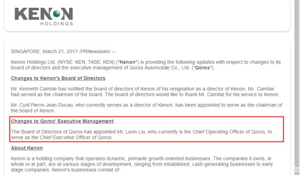 发表日期:2017-03-23在经历了一年的空窗期后,观致汽车终于迎来了新一任的掌门人。3月21日,观致汽车母公司Kenon Holdings在其官网发布公告称:公司董事会任命原观致汽车COO(首席运营官)刘良为观致汽车CEO(首席执行官)。
