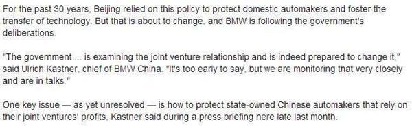 宝马中国首席执行官康思远在接受外媒采访时表示:“中国目前正在审核合资企业的关系,并准备进行改革,我们正密切跟踪进程并进行必要的商谈。”