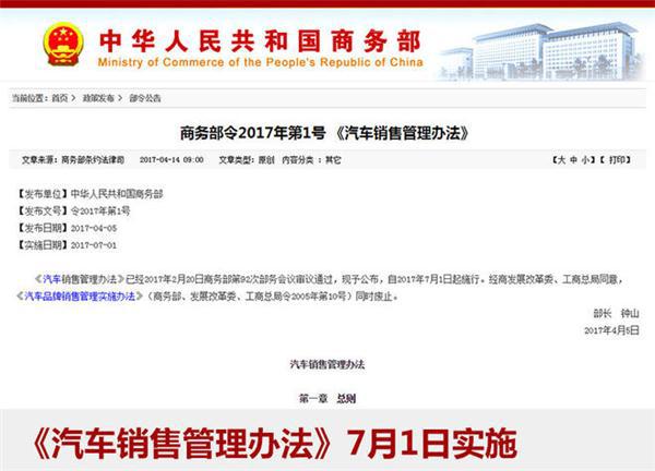 发表日期:2017-06-30商务部最新的《汽车销售管理办法》已于2017年4月5日正式发布,此办法自2017年7月1日起施行。同时经发展改革委、工商总局同意,现有的《汽车品牌销售管理实施办法》(商务部、发展改革委、工商总局令2005年第10号)也将于同一时间废止。