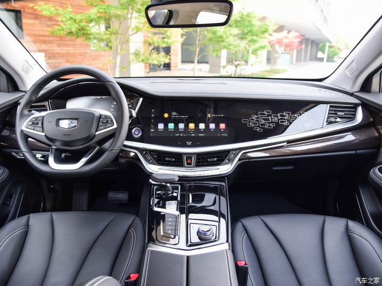 内饰方面,新车采用了吉利家族最新的设计风格,其采用了环抱式中控台设计,整体线条以直线为主,同时三辐式多功能方向盘搭配木纹饰板以及镀铬装饰条,从而提升了其豪华感。同时,该车中控台饰板以及两侧车门饰板处加入了多种大小组成的矩形元素氛围灯,预计点亮后有着不错的视觉效果。