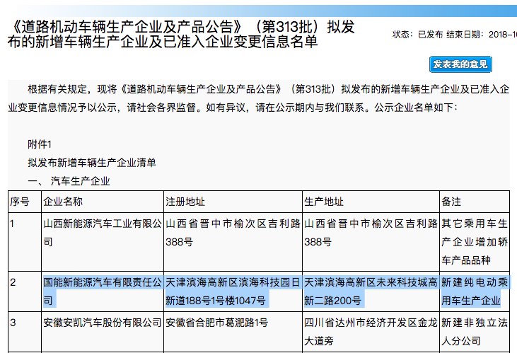 发表日期:2018-10-18又一家造车新势力即将正式登场。10月17日,工信部发布了第313批《道路机动车辆生产企业及产品公告》,在拟发布新增汽车生产企业清单一栏中,国能新能源汽车有限责任公司(简称“国能新能源”)列入。此次公告时间截至10月23日,这意味着,若无意外,国能新能源生产项目将获得工信部审批通过,成为全国第9家拿下纯电动乘用车生产资质(简称“资质”)的企业。